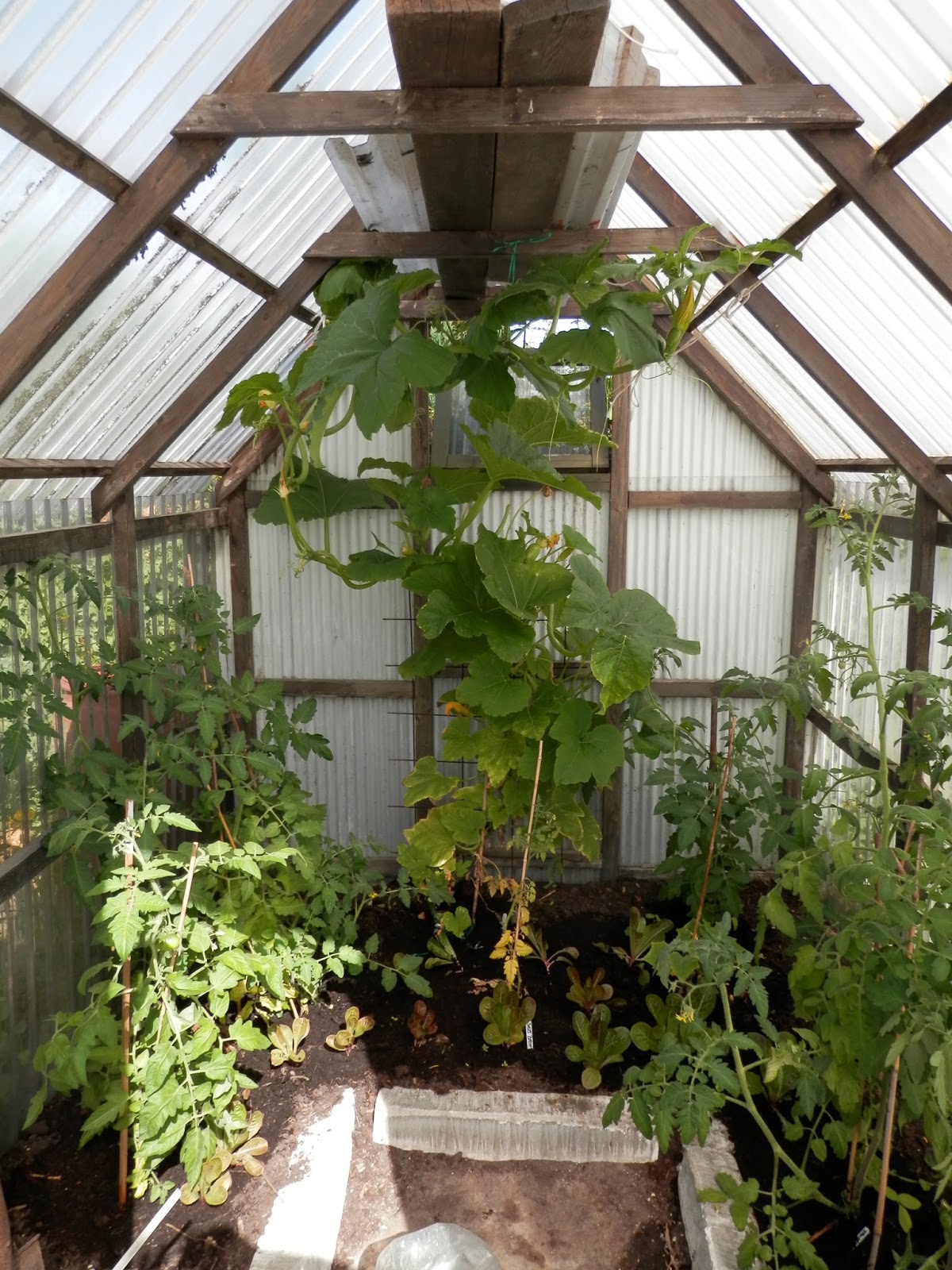 'Drivhuset' er fuldstændig berøvet for sollys, for det er lavet af trapezplader, der er så gamle, at de er blevet helt hvide. Jorden var i foråret som pulver - ekstremt tør og helt uden næring. Vi skiftede ca. 1/3 ud med ren kompost fra genbrugspladsen og vandede ekstremt grundigt.